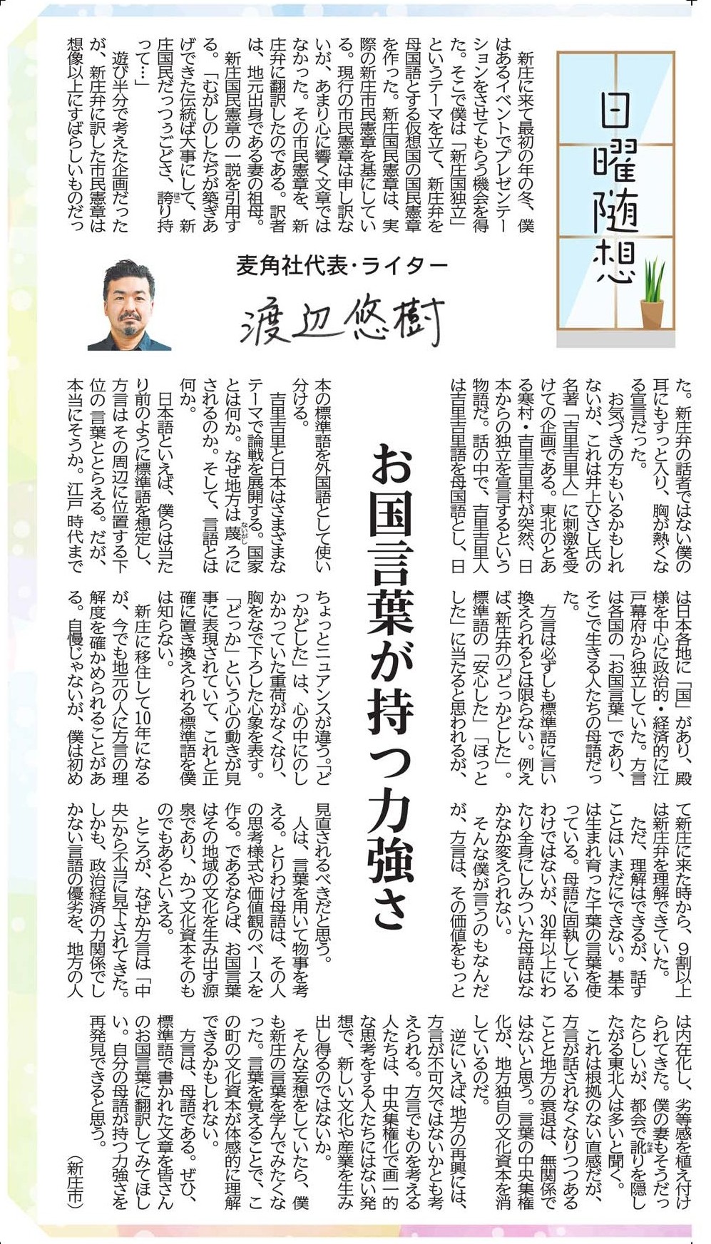 コラム 02Jan2026 【山形新聞 日曜随想|2025年11月9日掲載】お国言葉が持つ力強さ Tweet Tweet コラム コメント: 0 【山形新聞 日曜随想|2025年10月5日掲載】自由で変人な父に感謝 【山形新聞 日曜随想|2025年12月14日掲載】上野公園に生きる 関連記事一覧 【山形新聞 日曜随想|2025年10月5日掲載】自由で変人な父に感謝 【山形新聞 日曜随想|2025年6月22日掲載】分をわきまえないこと 【山形新聞 日曜随想|2025年8月31日掲載】医師の言霊、私の糧に 【山形新聞 日曜随想|2025年7月27日掲載】数値化されない幸せ 【山形新聞 日曜随想|2025年12月14日掲載】上野公園に生きる 【山形新聞 日曜随想|2025年2月2日掲載】体に馴染む 雪ある生活 コメント ( 0 ) トラックバックは利用できません。 この記事へのコメントはありません。